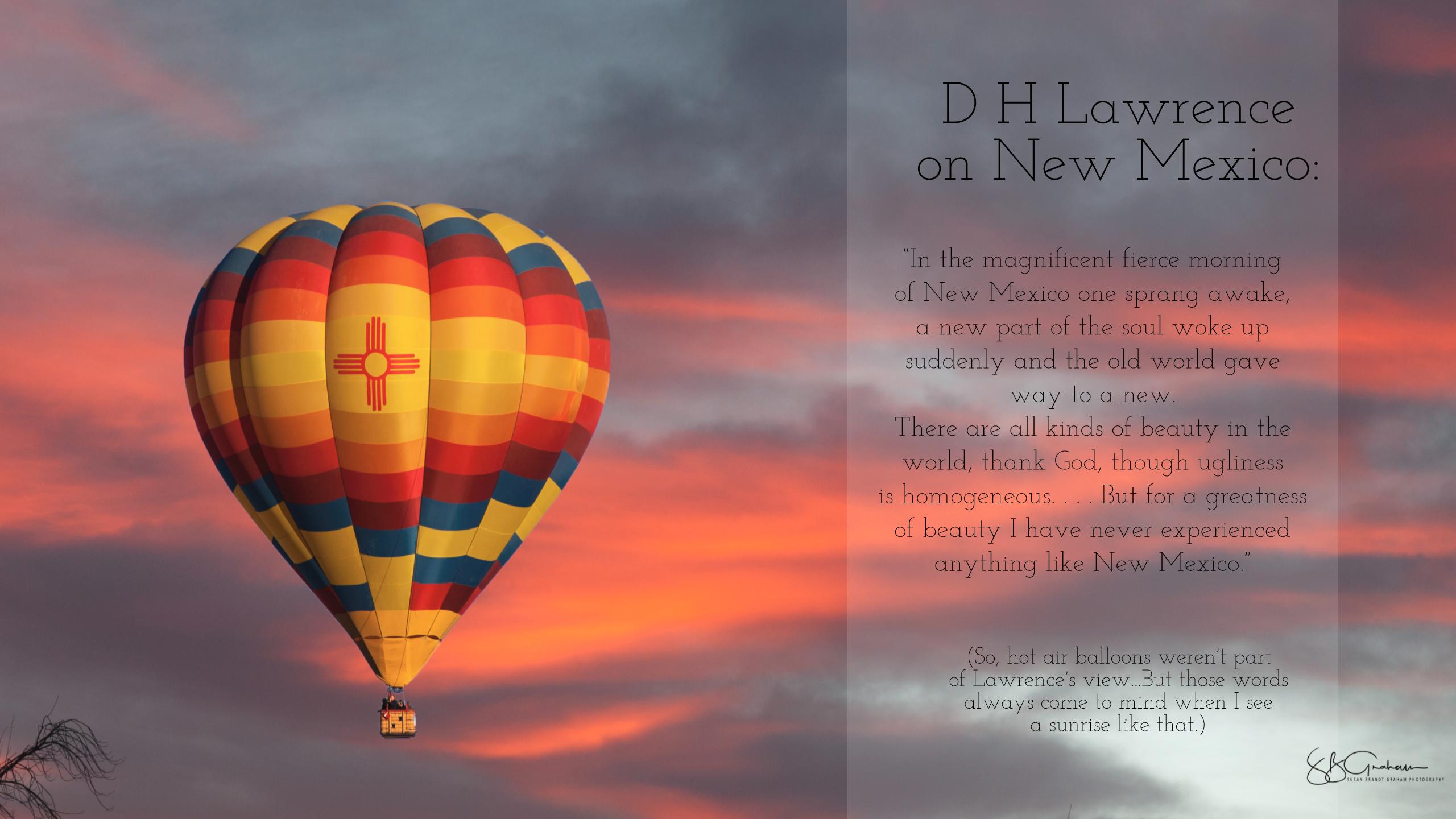 Uniquely New Mexico: so many things! All of you know how much I love so many things about New Mexico. Just because wanted to, I took a few minutes to unwind with new software, my kind of sunrise, and a perfect New Mexico balloon. I think of the D H Lawrence quote almost every time I see a sunrise here with clouds.