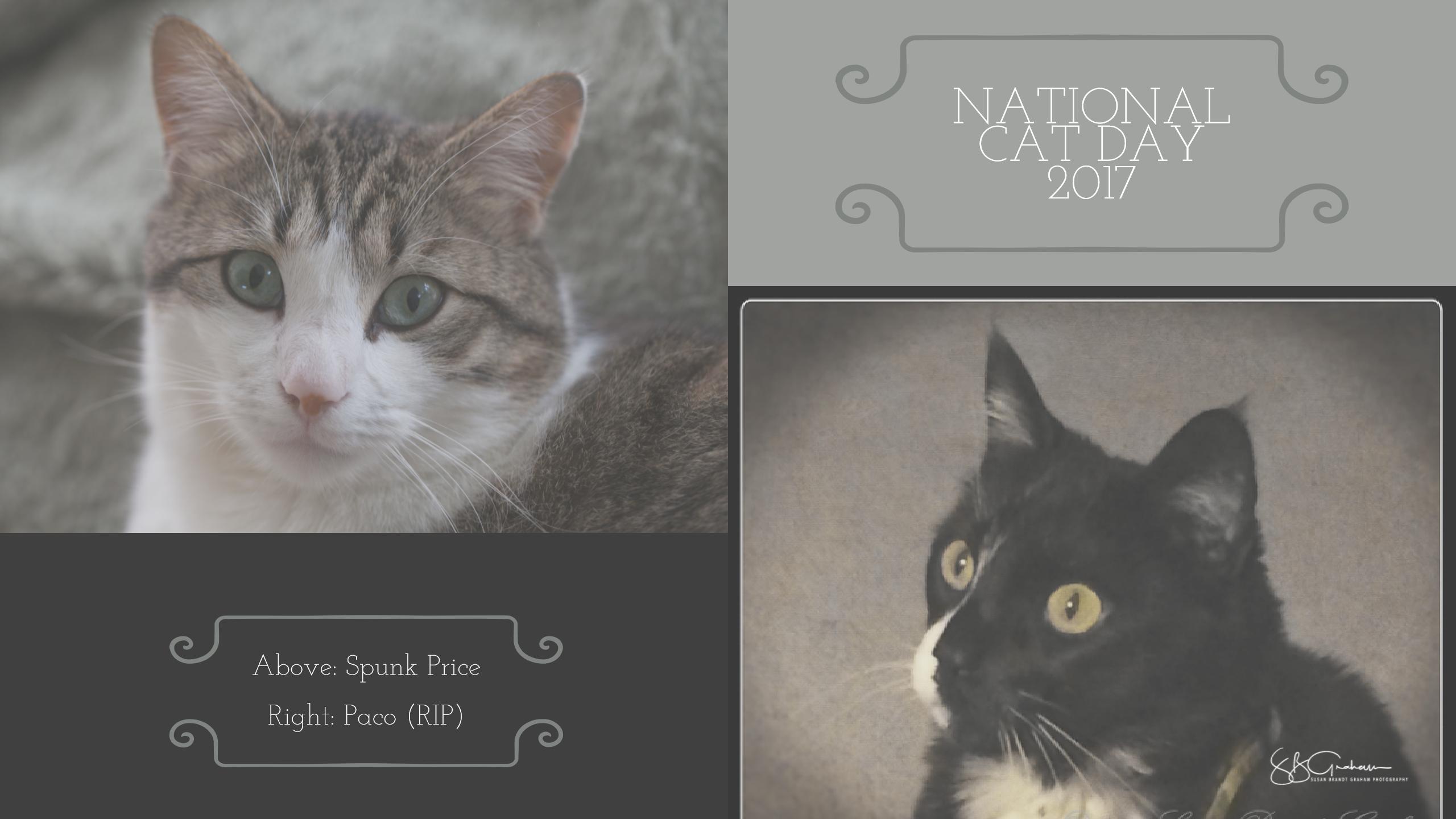 National Cat Day. Who knew October 29, 2017 was so designated? I didn’t until I woke up and turned on the computer. So, here is a pic of Tim and Laurie Price’s Spunk, the cat who is really sweet but who also is so curious he can get into a lot of trouble. He had to become a photographer’s model to earn enough to pay down his running tab for things destroyed. 😉 The other is my cat Paco (RIP), a sweet little companion in his final years.